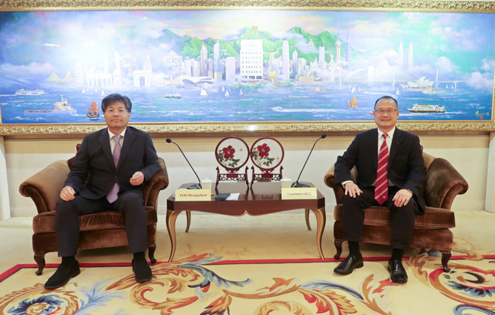 全国政协常委、香港中华总商会会长、新华集团主席蔡冠深博士日前在港会见韩国新任驻港总领事柳泂喆一行。