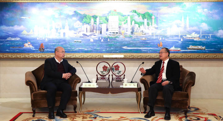 1月27日上午,全国政协常委、香港中华总商会会长、粤港澳大湾区企业家联盟主席、新华集团主席蔡冠深博士在香港会见广东省委常委、统战部部长王瑞军一行,双方就粤港两地加强合作交流意见。