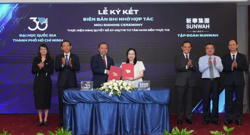 2025年5月24日,胡志明市国家大学举行“第57-NQ/TW号决议:从愿景到实施国家-学校-企业合作模式”计划启动仪式,新华集团越南副总裁兼胡志明市首席代表阮香香、胡志明市国家大学总校长武海君副教授代表双方交换谅解备忘录。