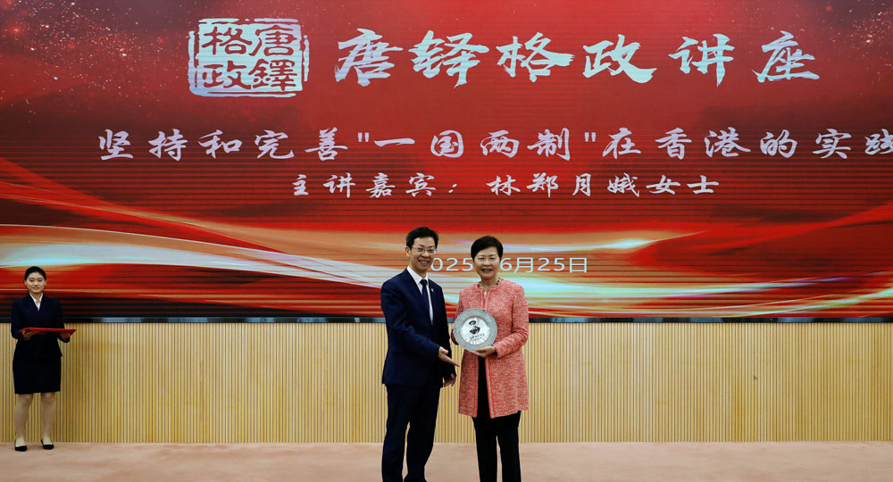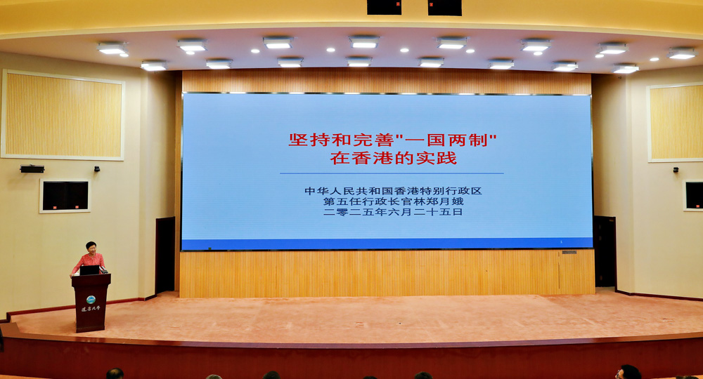 座谈后,林郑月娥女士在辽宁大学蔡冠深学术报告厅作了《坚持和完善“一国两制”在香港的实践》的报告。报告以六个篇章,从历史唯物、实践经验及个人体会,深刻阐述全面贯彻“一国两制”是保持香港繁荣稳定、行稳致远最坚实的基础和保证,以及香港在新征程中的机遇与担当。讲座中她亦对蔡冠深博士的家国情怀,全力推动香港与内地,特别是辽港教育文化交流等成就作出高度肯定。赢得师生们的热烈欢迎。